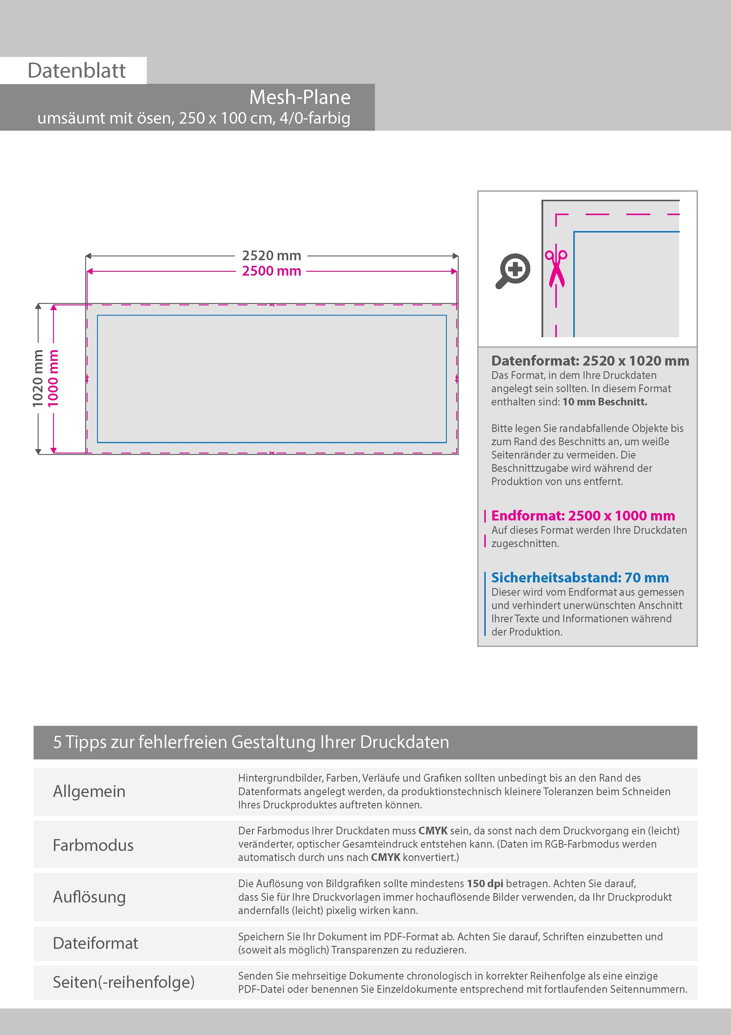Hochwertige Mesh-Plane 250 x 100 cm, 4/0-farbig bedruckt, Umsäumt + Ösen im Abstand von 50 cm links und rechts
