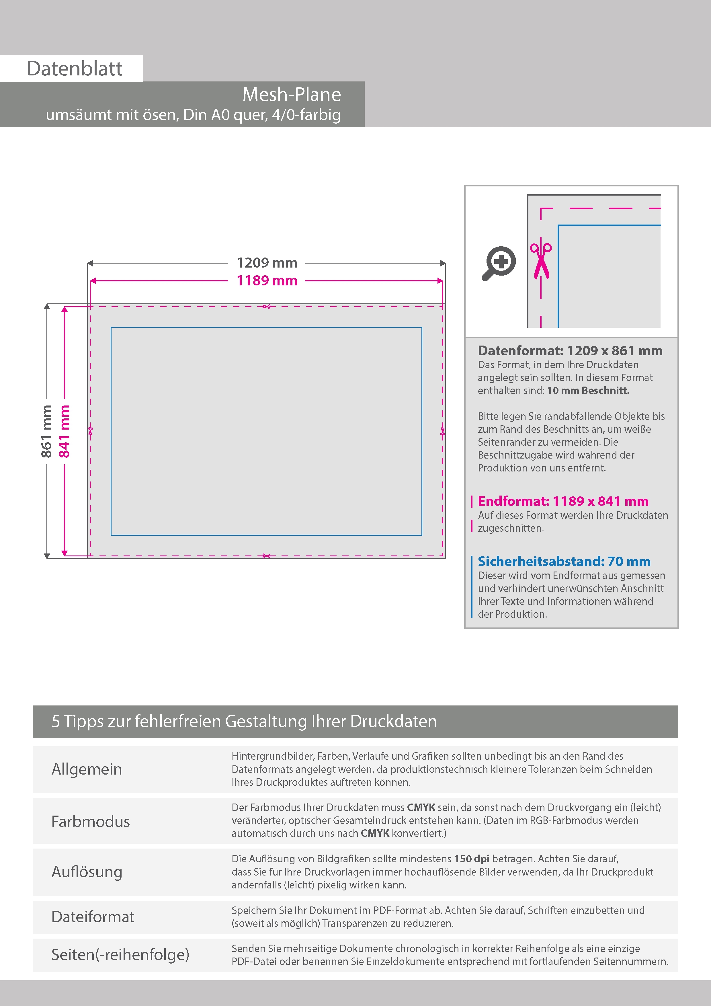 Hochwertige Mesh-Plane DIN A0 quer (118,9 x 84,1 cm), 4/0-farbig bedruckt, Umsäumt + Ösen im Abstand von 50 cm rundum