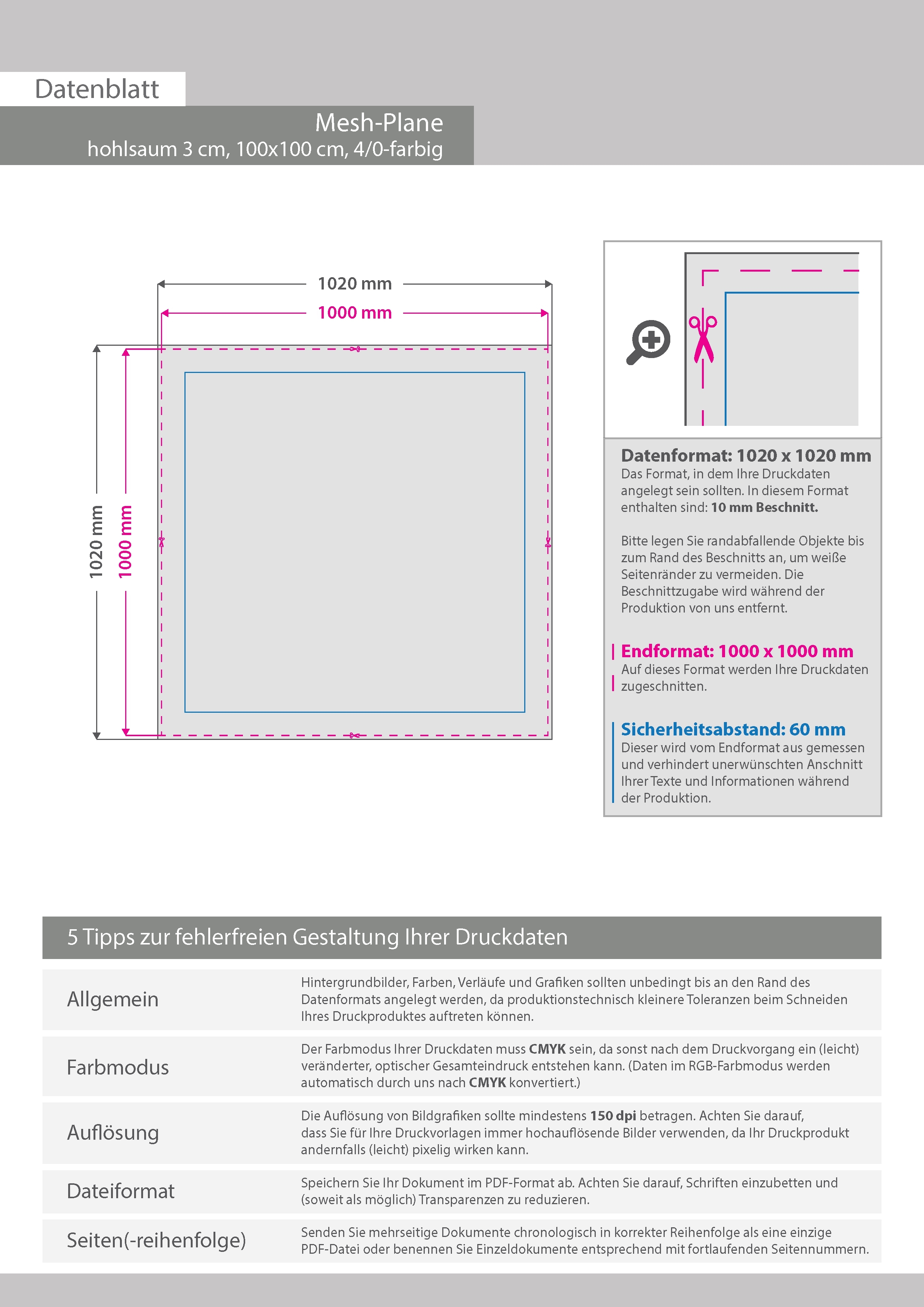 Hochwertige Mesh-Plane 100 x 100 cm, 4/0-farbig bedruckt, Hohlsaum oben und unten (Durchmesser Hohlsaum 3,0 cm)
