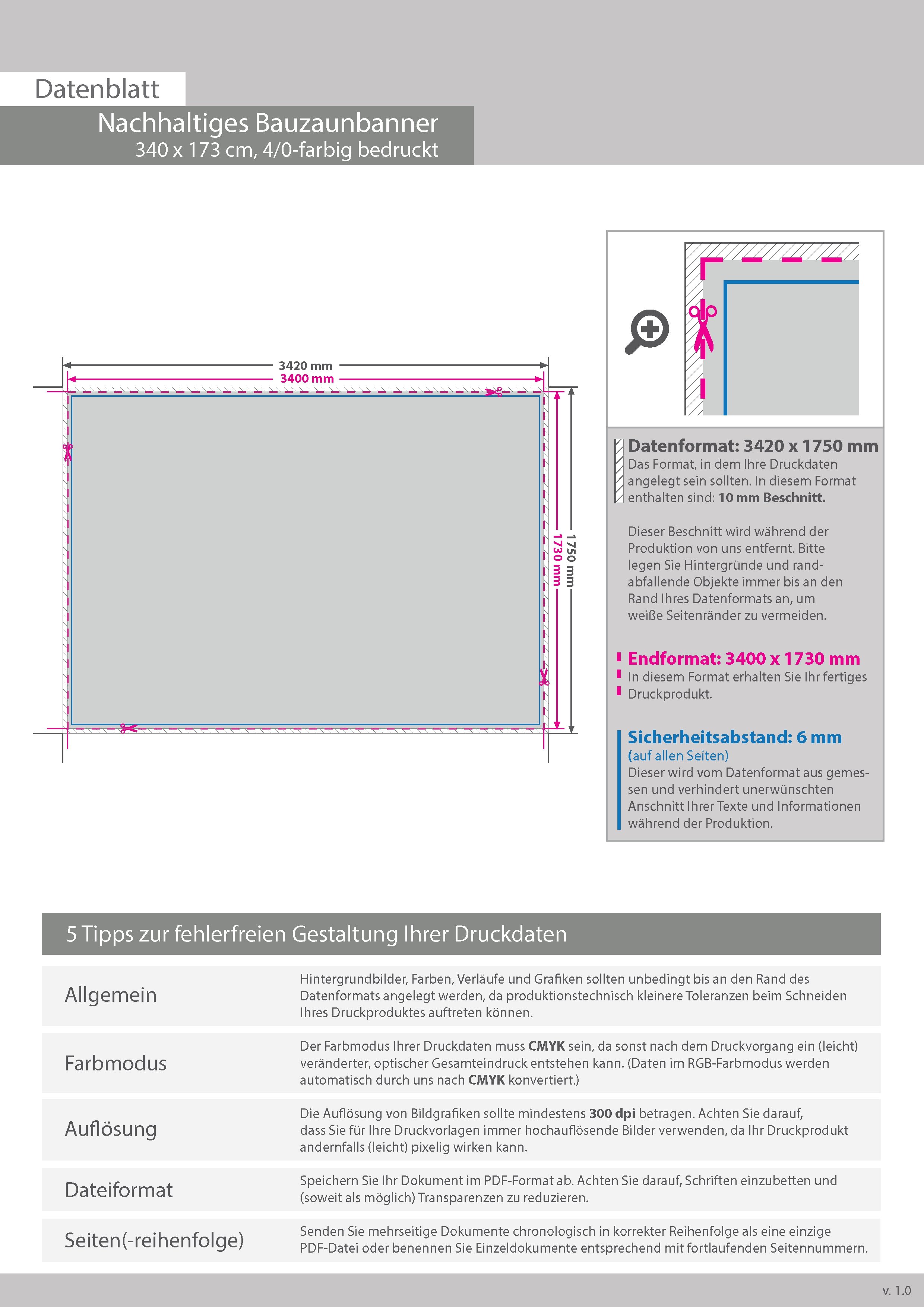 Nachhaltiges Bauzaunbanner 340 x 173 cm, 4/0-farbig bedruckt, umsäumt und Ösen im Abstand von 50 cm rundum