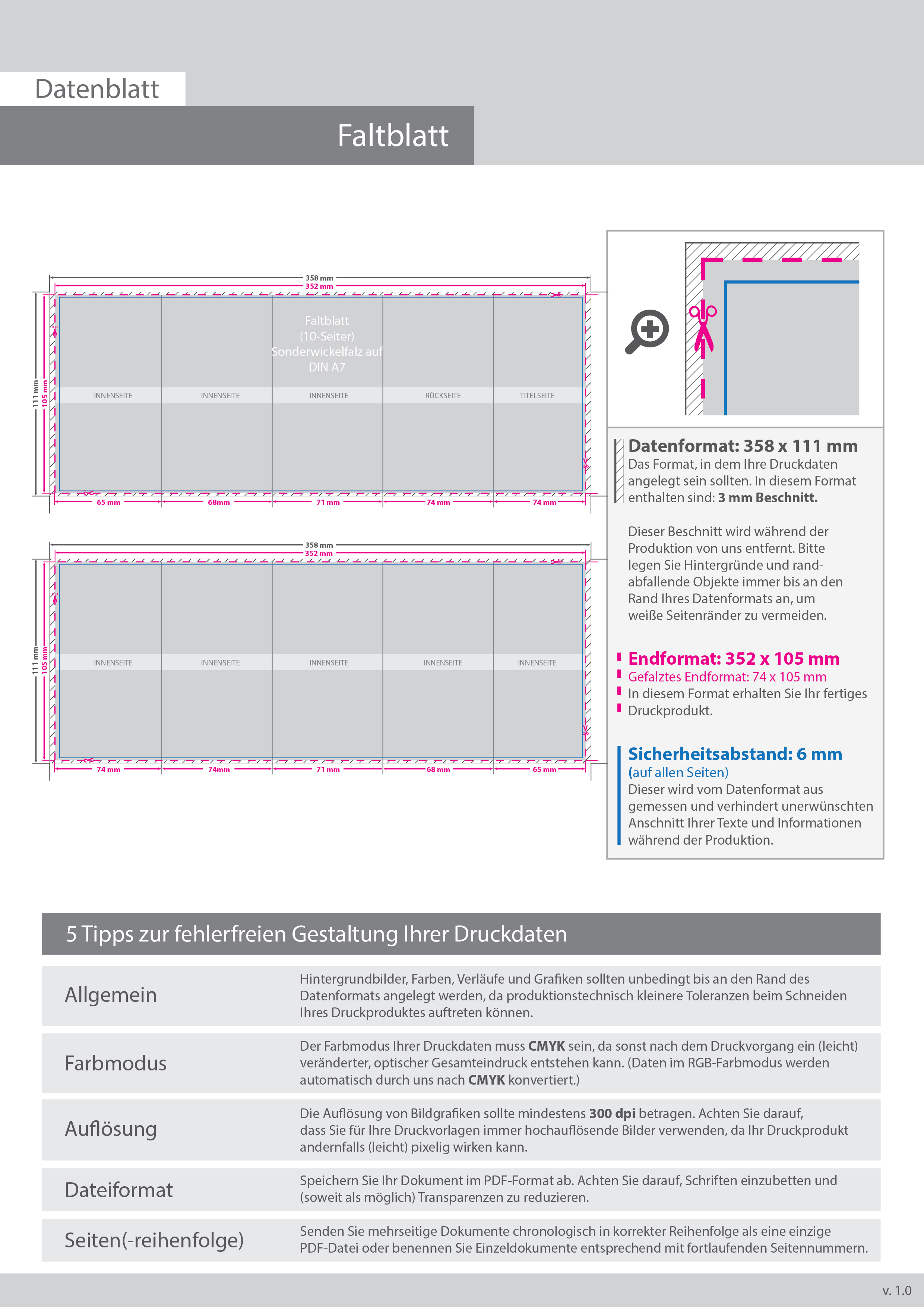 Faltblatt, gefalzt auf DIN A7, vertikaler Wickelfalz, 10-seitig