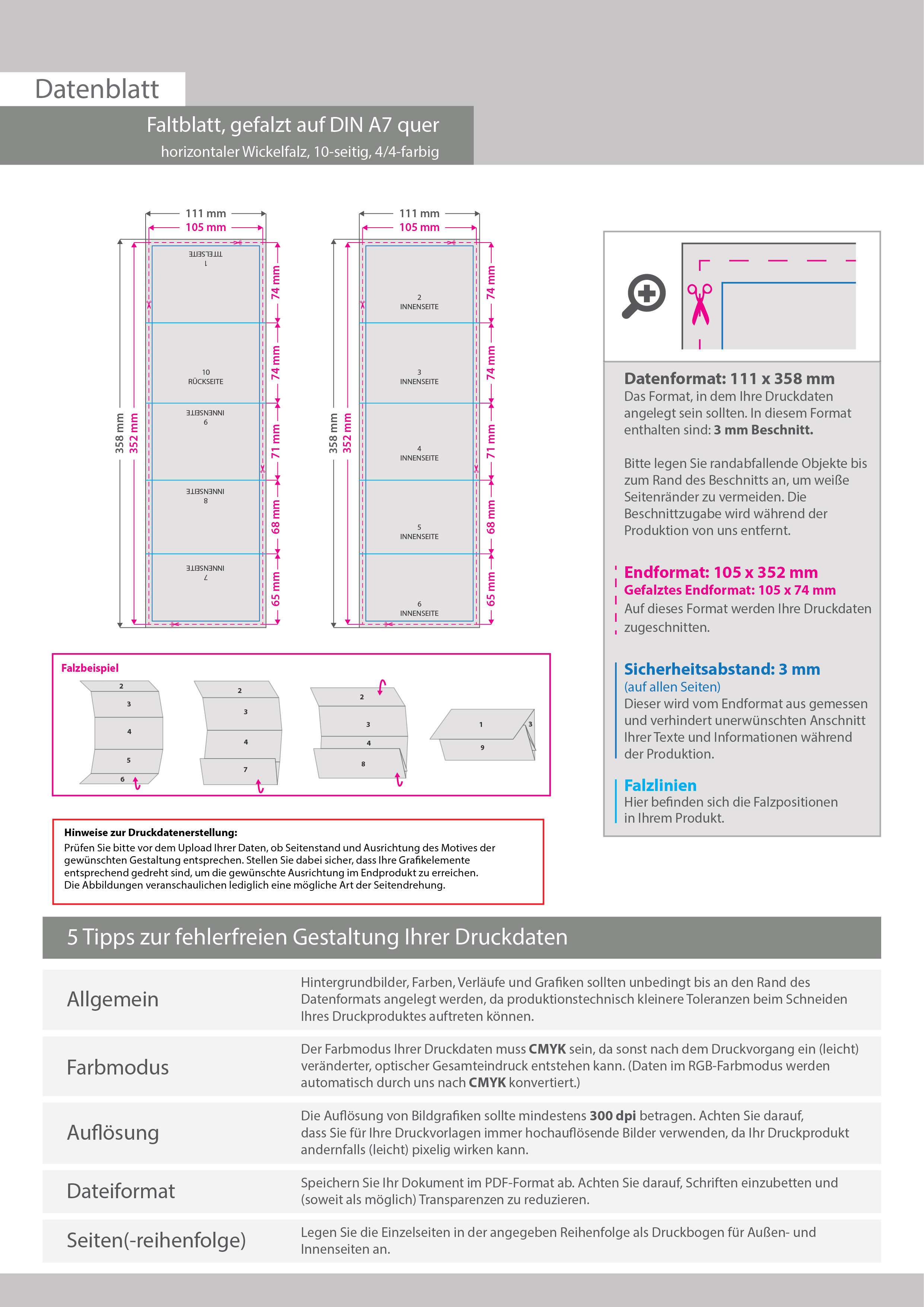 Faltblatt, gefalzt auf DIN A7 quer, horizontaler Wickelfalz, 10-seitig
