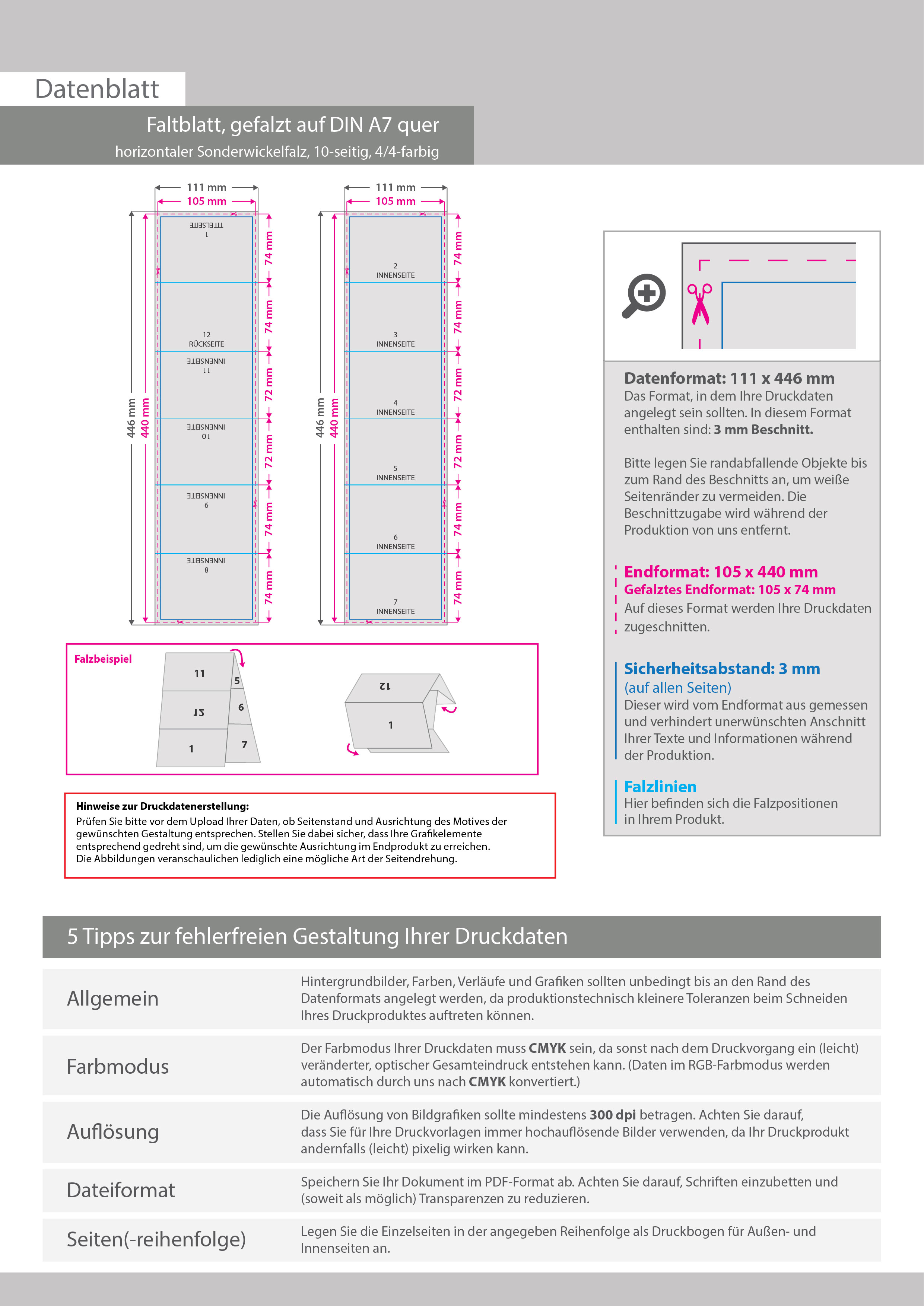 Faltblatt, gefalzt auf DIN A7 quer, horizontaler Sonderwickelfalz, 12-seitig